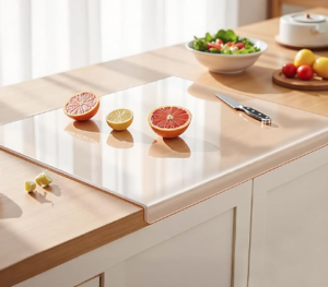Large Acrylic Counter Cutting Board with “Lip”: This cutting board is clear, large, and has a “shelf lip” to keep it from sliding or moving while you cut. It’s permanently on our kitchen island next to the sink and ready whenever we need it. Because it’s clear you don’t notice it, and it’s nice and big so you can have a big cutting work station available at all times. Come in a variety of sizes.