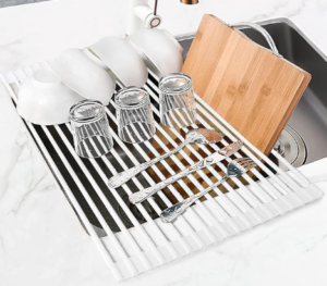 Over the Sink Drying Rack/Strainer: This sits over the side part of our sink (it can be easily folded over or rolled to take up as little or as much space as you want) and we use it as a dish drying rack and as a place to wash fruits and vegetables (they drain/dry directly into the sink). No need for a big clunky dish drainer on the counter. They come in a variety of sizes and colors, so measure your sink before you purchase.