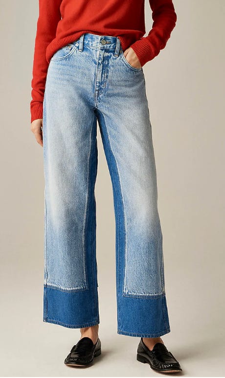 We’re seeing some combo denim jeans for spring, like these color-blocking ones from J.Crew, for a fresh take on blue denim. High rise, ankle-length inseam, slim through the hip, and wide through the thigh and leg. Jo has these and loves them!