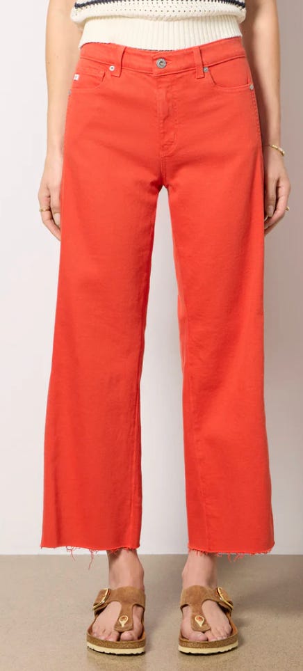 Add a pop of color to your outfit with AG’s iconic Sage jean in this perfect red, featuring a mid-rise fit, wide leg, and raw ankle-length hem.