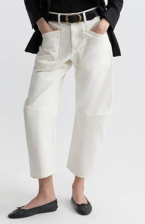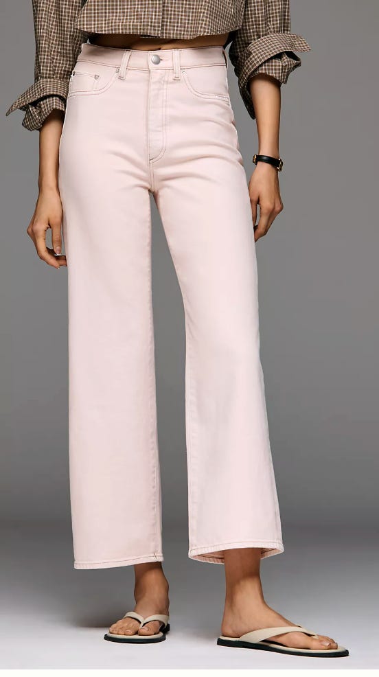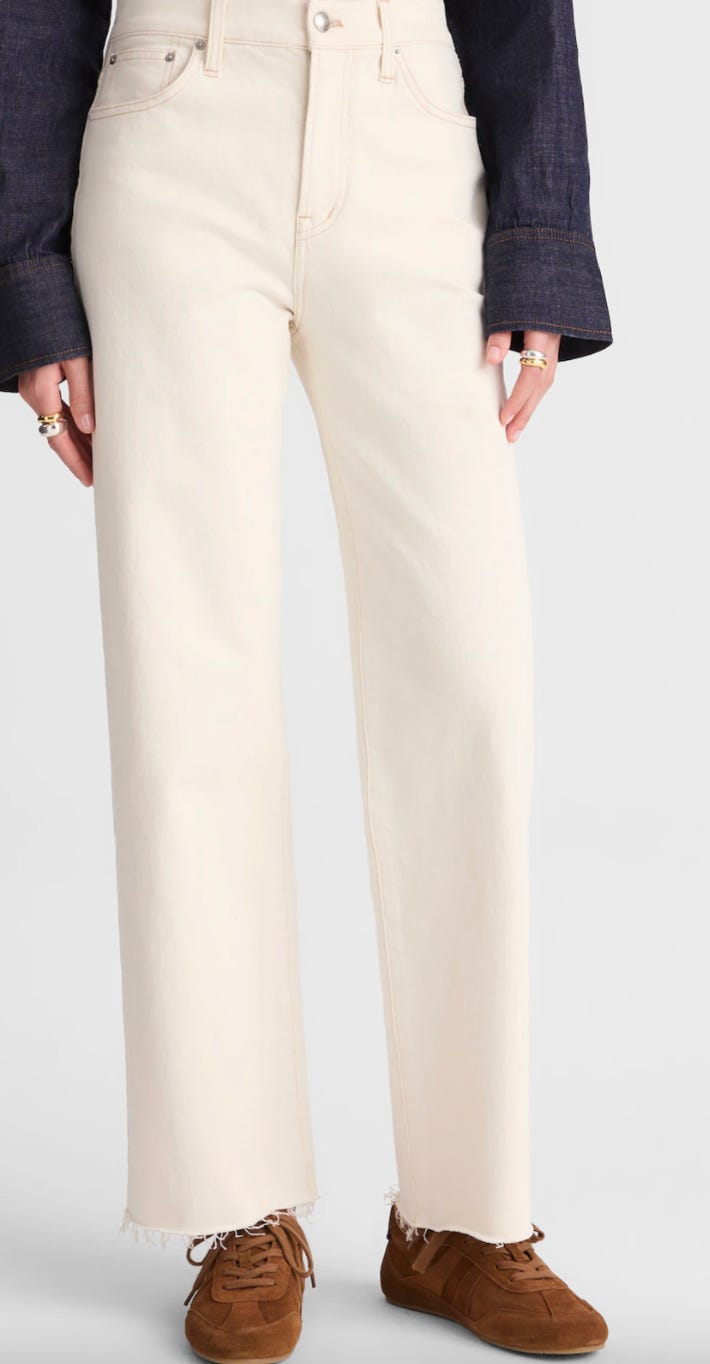 Madewell has some great off-white choices, a great transition to spring. The Perfect Vintage Wide Leg Crop, in Vintage Canvas, has a wide leg – but not too wide – and is cropped with a raw hem.